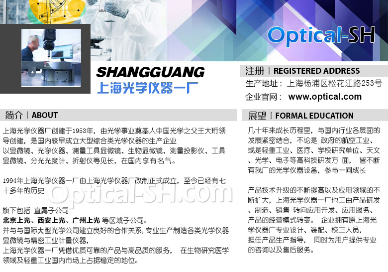 上海光學儀器一廠坐落在上海楊浦區(qū),原上海光學儀器廠,現(xiàn)屬上海光學儀器研究所管轄生產(chǎn)型制造公司。上海光學儀器研究所擔負光學儀器新產(chǎn)品研制和開發(fā),曾為上海光學儀器廠研制開發(fā)出各類光學儀器產(chǎn)品,填補了我國多項光學儀器的空白,現(xiàn)通過多次改制在原產(chǎn)品的基礎上不斷開發(fā)出各類更好的光學儀器,我們相信我們的產(chǎn)品將能給您帶來更多的方便,為您在工作中排憂解難。